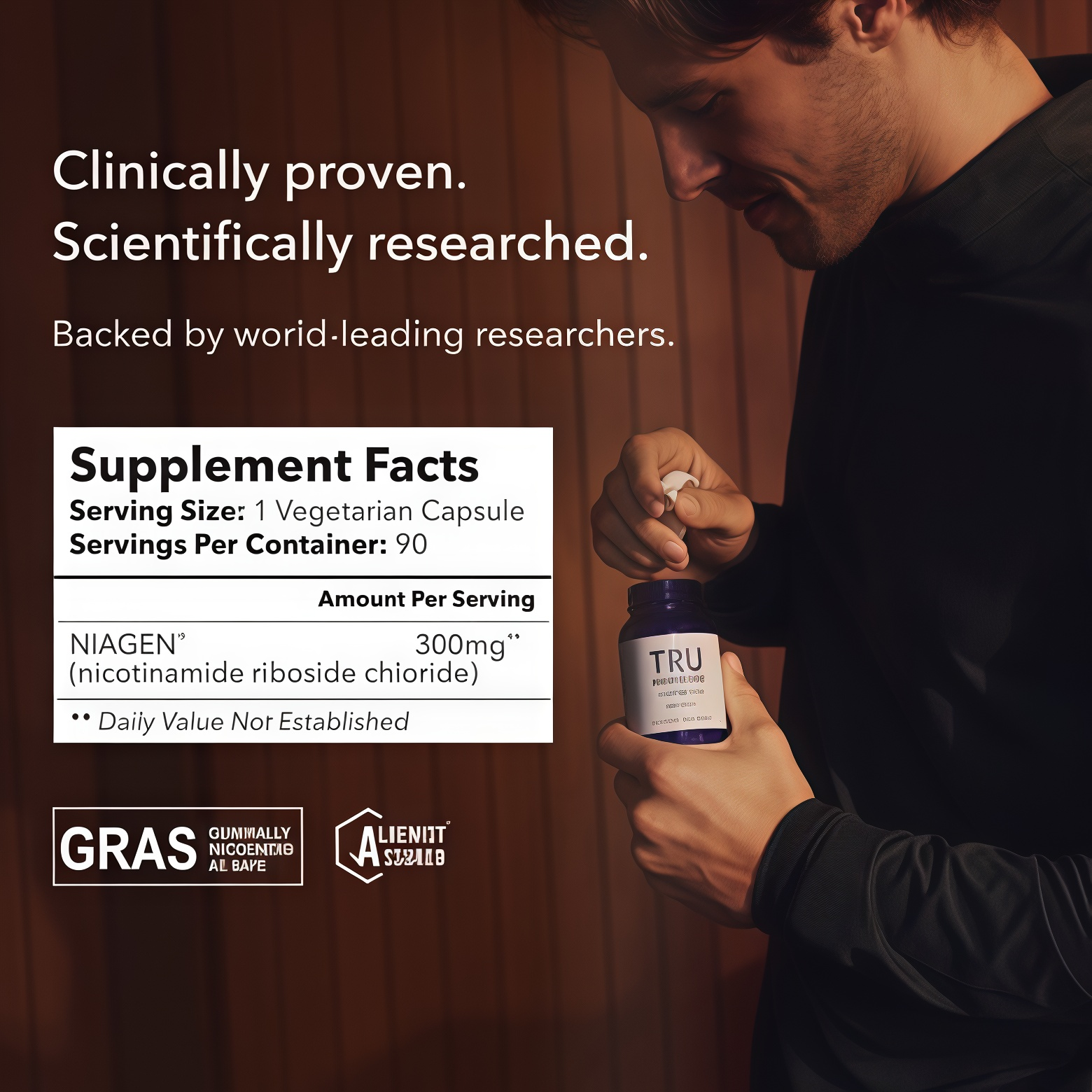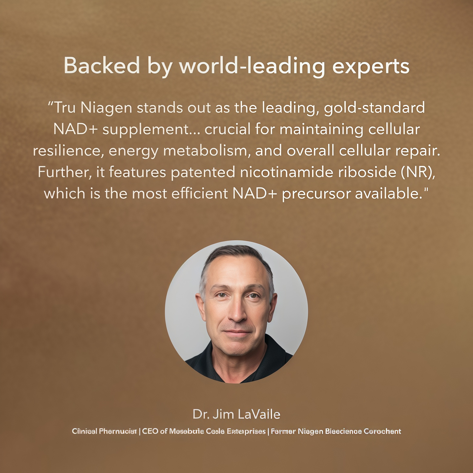 "Tru Niagen stands out as the leading, gold-standard NAD+ supplement...crucial for maintaining cellularresilience,energy metabolism, and overall cellularrepair. Further, it features patented nicotinamideriboside (NR), which is the most efficient NAD+precursor available."